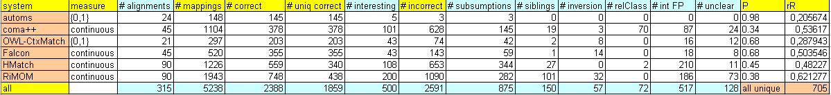 name of their systems (Automs, Coma++, OWL-CtxMatch, Falcon, HMatch and RiMOM). Finally, there is row with overall statistics.