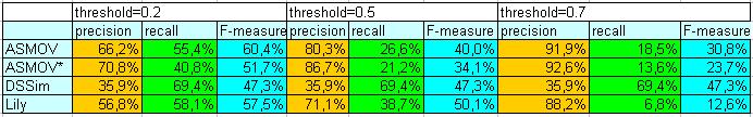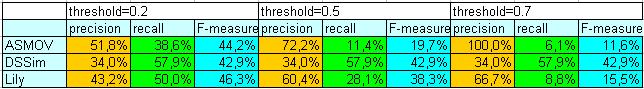 In the table below, there are results of all three participants with regard to Mannheim reference alignment. There are traditional measures - precision and recall and their harmonic mean (F-measure) computed for three thresholds 0.2, 0.5, and 0.7.