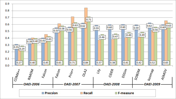 The quality of the best F-measure result of 2009 (0.63) achieved by ASMOV is higher that the best F-measure of 2008 (0.49) demonstrated by DSSim and higher than that of 2006 by Falcon (0.43), but still lower than the best F-measure of 2007 (0.71) by OLA2. The best precision result of 2009 (0.62) achieved by kosimap is lower than the best precision value of 2008 (0.64) demonstrated by ASMOV and equal to the results obtained in 2007 by both OLA2 and X-SOM. Finally, for what concerns recall, the best result of 2009 (0.65) achieved by ASMOV is higher that the best value of 2008 (0.41) demonstrated by DSSim and the best value in 2006 (0.45) by Falcon, but still lower than the best result obtained in 2007 (0.84) obtained by OLA2.