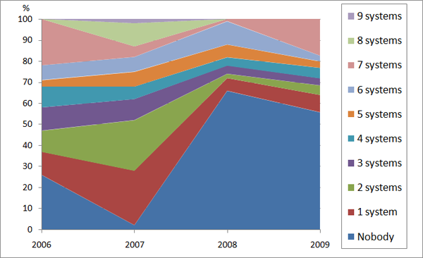 Figure 7. Comparison of partitions of the system results on negative correspondences in 2006, 2007, 2008 and 2009.