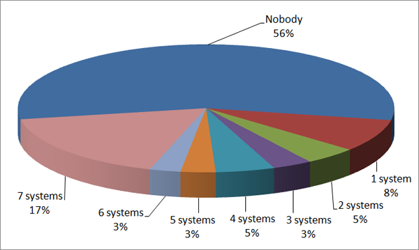 Figure 4 shows that the systems managed to discover only 68% of the total number of positive correspondences (Nobody = 32%). Only 26% of positive correspondences were found by all seven participating systems. The percentage of positive correspondences found by the systems this year is higher than the values of 2008, when 54% of the positive correspondences where found. Figure 5 shows that more than half (56%) of the negatives correspondences were not found by the systems (correctly) in comparison to 66% not found in 2008. Figure 5 also shows that all participating systems found 17% of the negative correspondences, i.e., mistakenly returned them as positive. The last two observations suggest that the discrimination ability of the dataset remains still high as in previous years.