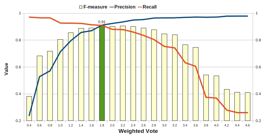 The figure below summarises the evolution of the F-measure, Precision and Recall for the harmonised alignment set depending on the minimum required votes. For example the harmonised alignment set requiring 4.0 points of weighted votes has a precision of 0.971 and a recall of 0.369 w.r.t. the UMLS reference alignment. As expected precision increases and recall decreases as the required votes increase.